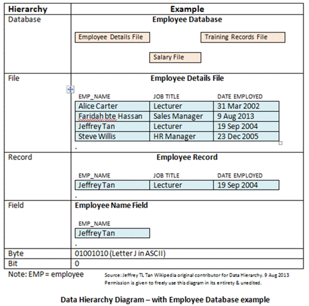 - Field : Sekumpulan byte yang membentuk satu unit informasi. Field sering kali mewakili atribut dari suatu entitas, seperti “Nama” atau “Alamat.”